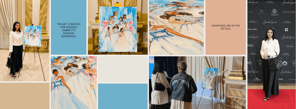 To celebrate Amanda’s fashion experience, I created something deeply personal: a custom canvas painting inspired by her couture collection. Each brushstroke is a tribute to the textures, tones, and silhouettes I saw in her collection. My painting reflected the softness of her designs. I added little crystals and beads to enhance the texture of the painting. It’s my way of honoring the artist and her beautiful work. I was honored to see people stopping by my canvas installation and initiating dialogue around it. Art is an expression and the real joy is when you see people talking about it.