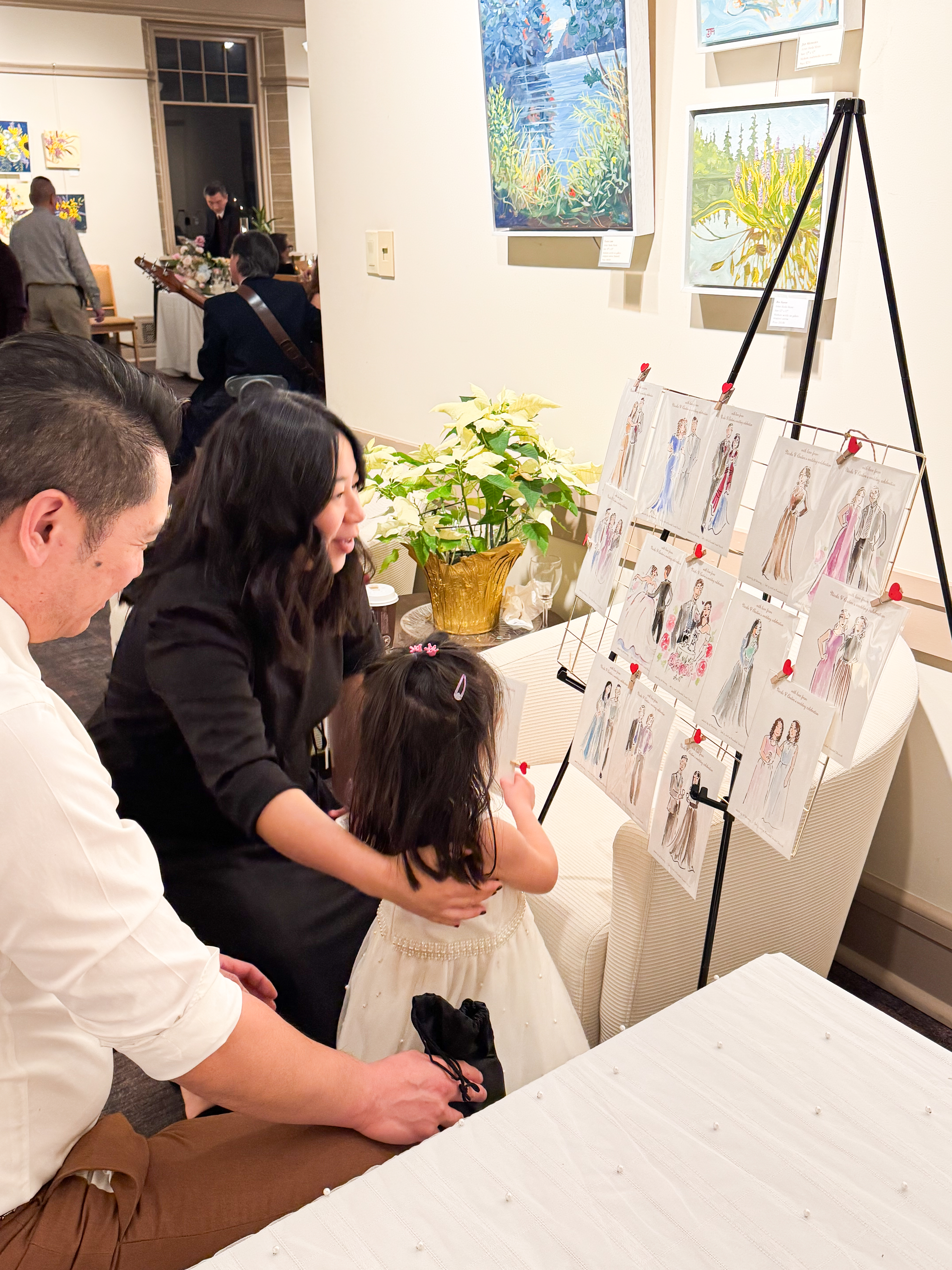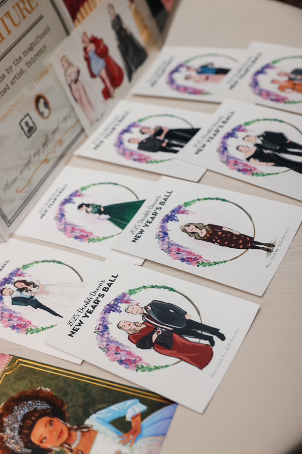 Instead of giving guests a generic gift, couples can offer a custom illustration created during the event. Each guest leaves with a hand-drawn portrait that captures their outfit and personality, making it a meaningful souvenir from the celebration.