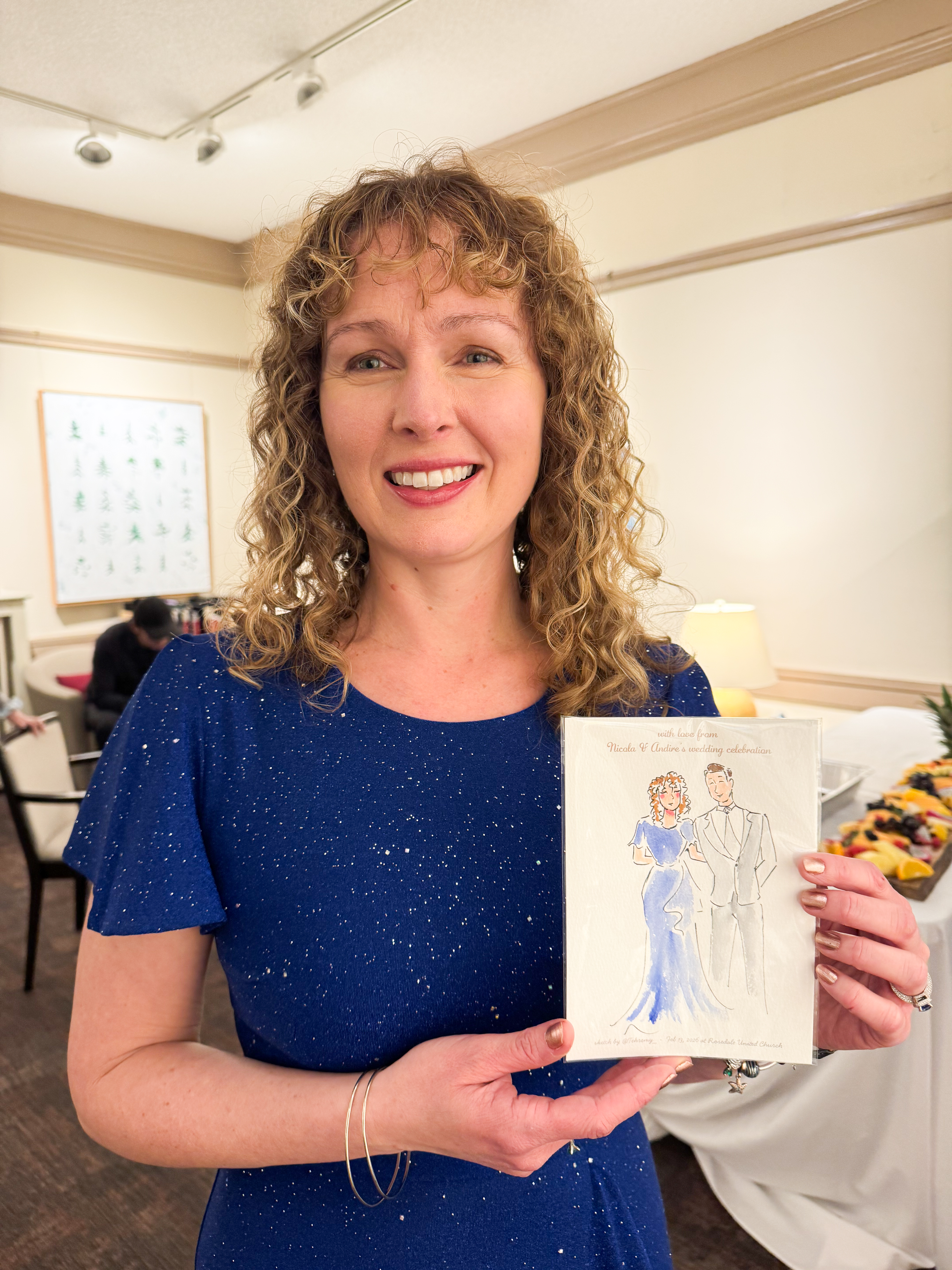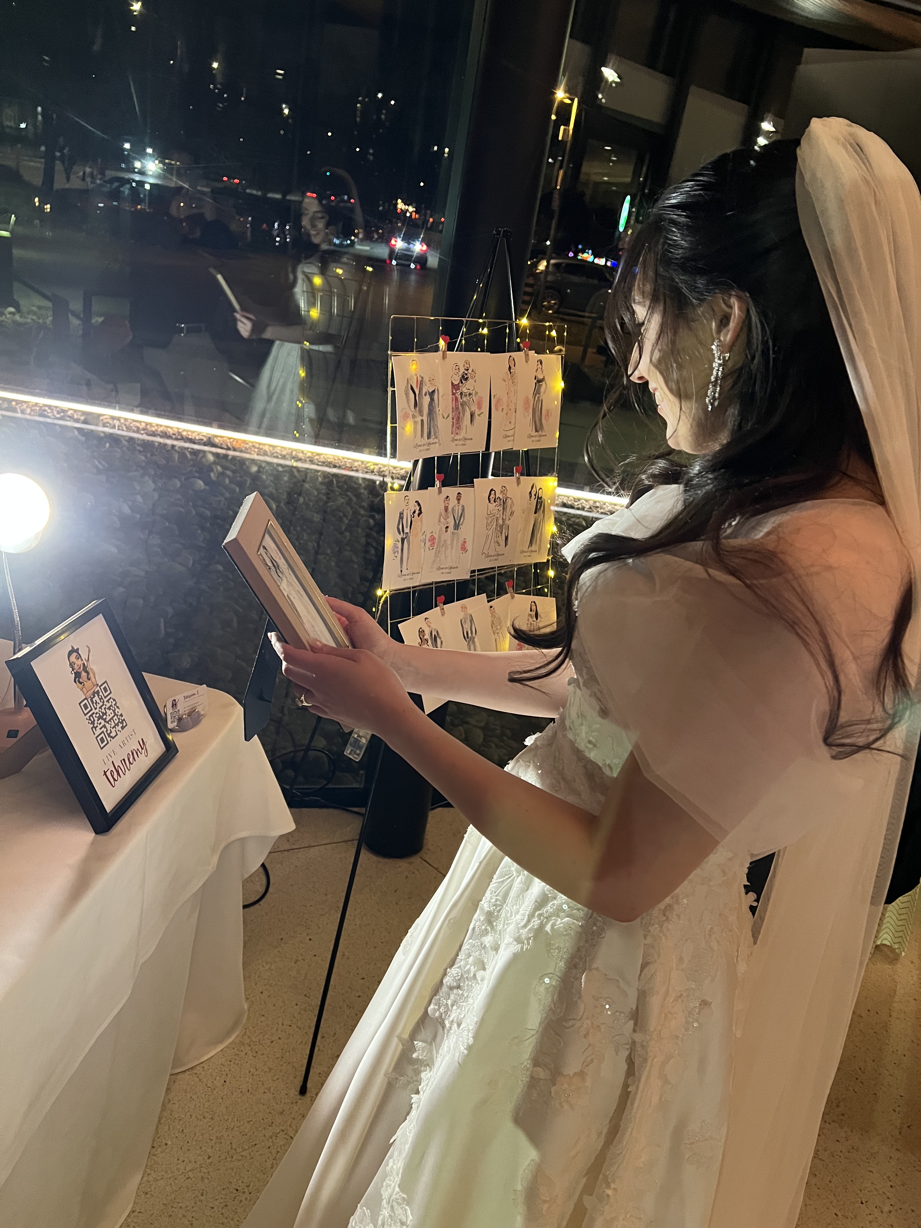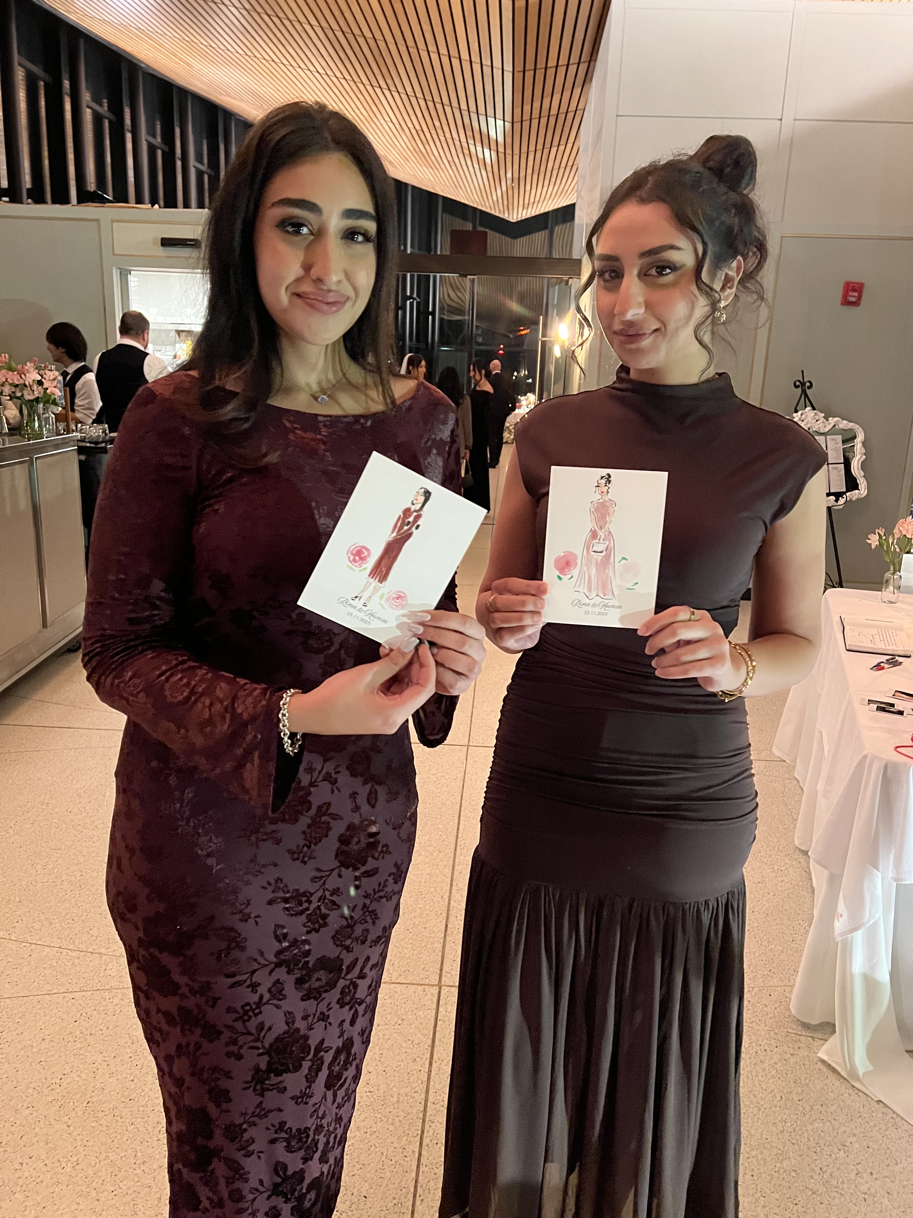 Guests love watching the sketches come to life and seeing how outfits, hairstyles, and accessories are captured in a fashion illustration style. It often becomes a small gathering point at the reception where people stop by, watch the artwork, and get excited to see their own sketch.