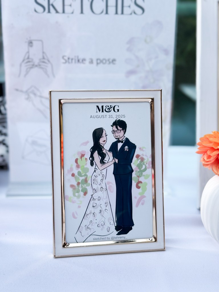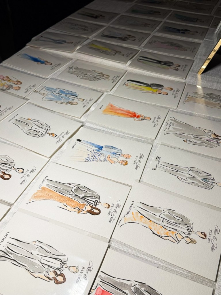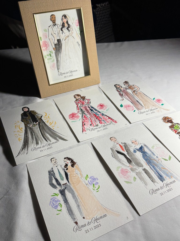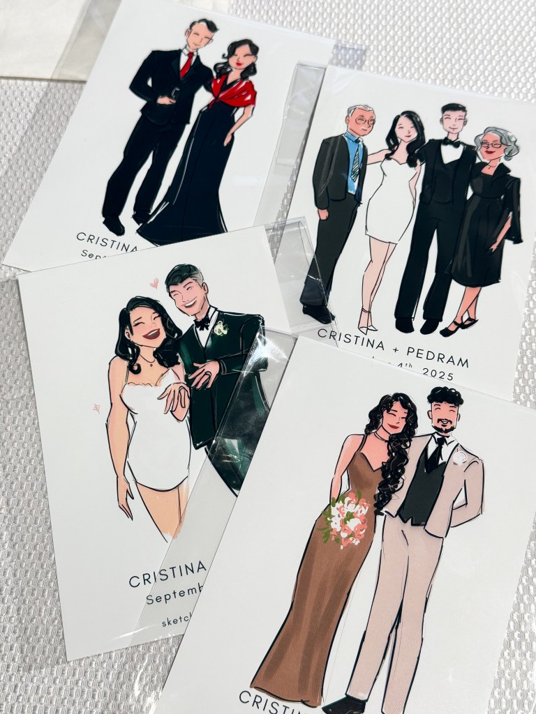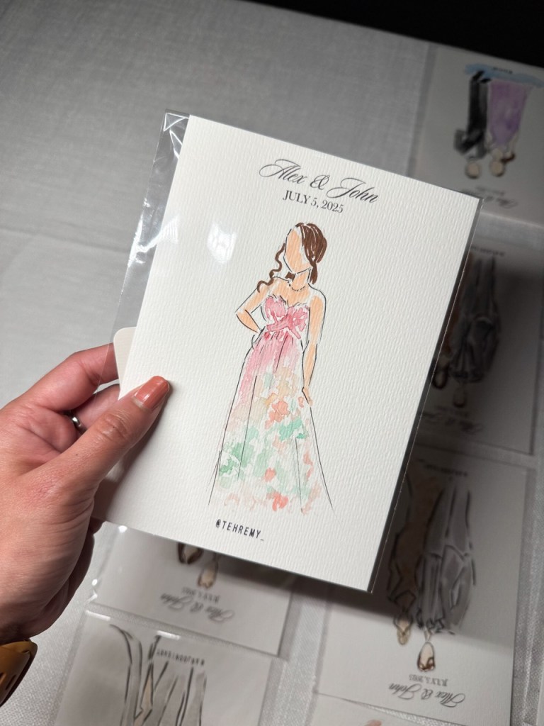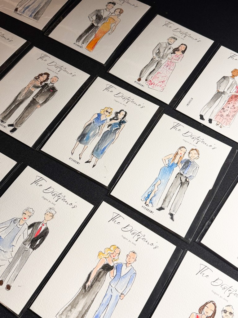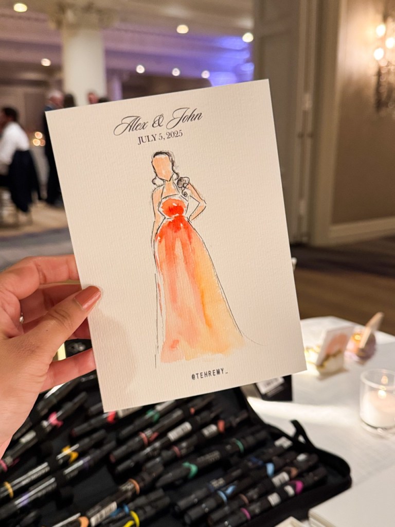 I sketch approximately 12–15 guests per hour on a first-come, first-served basis. Each illustration focuses on the guest’s outfit with minimal facial detail for a chic, editorial look.