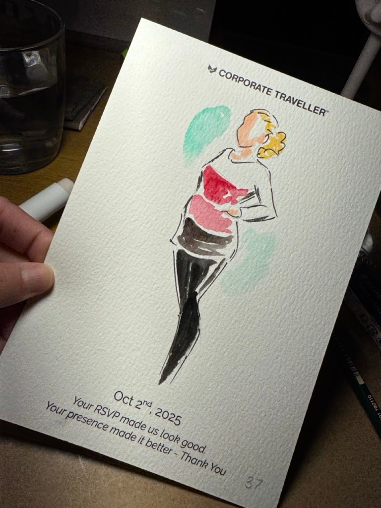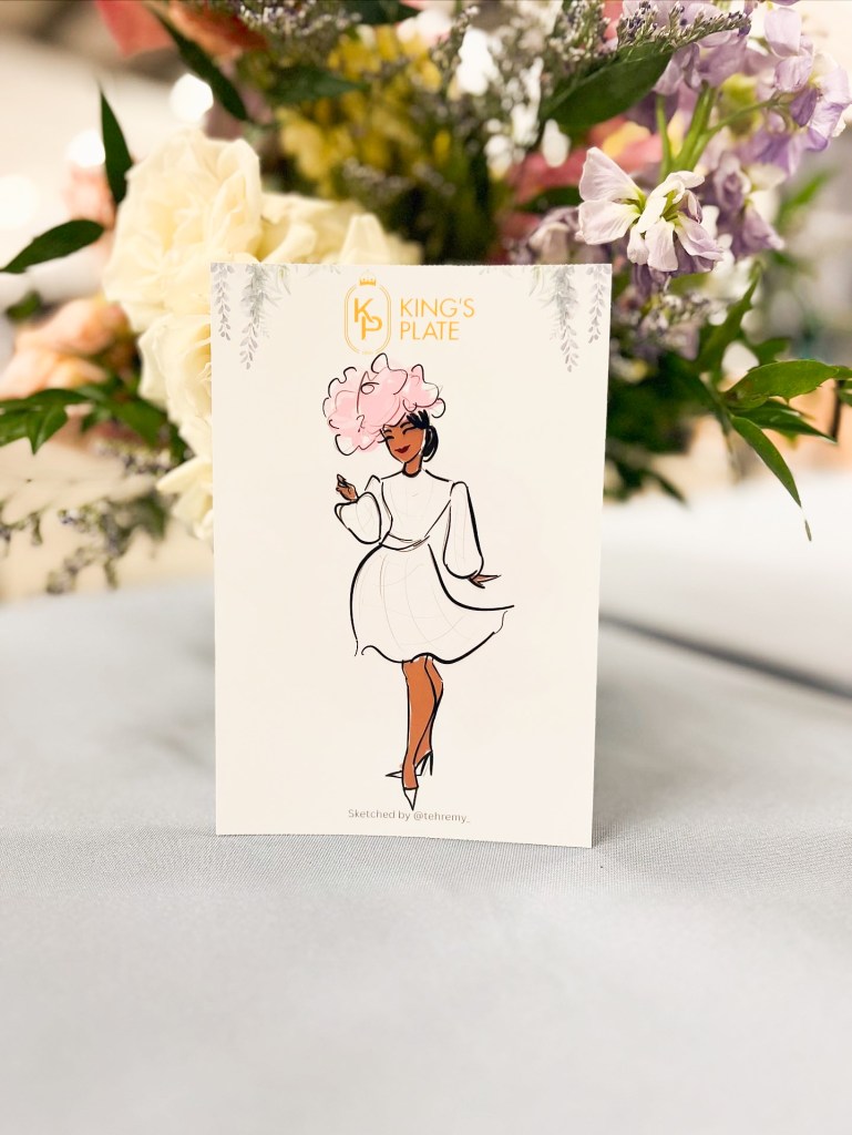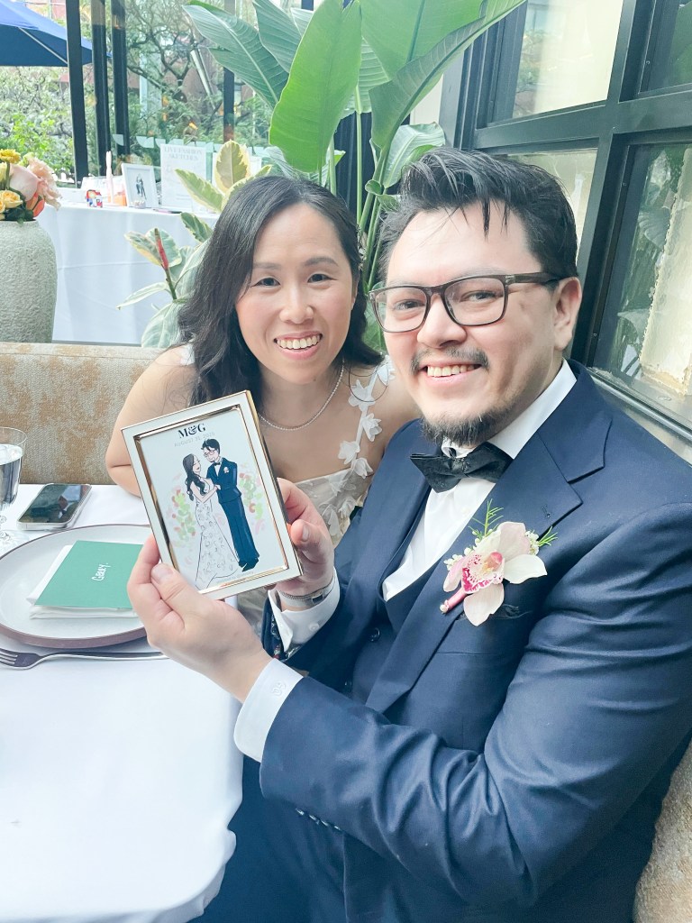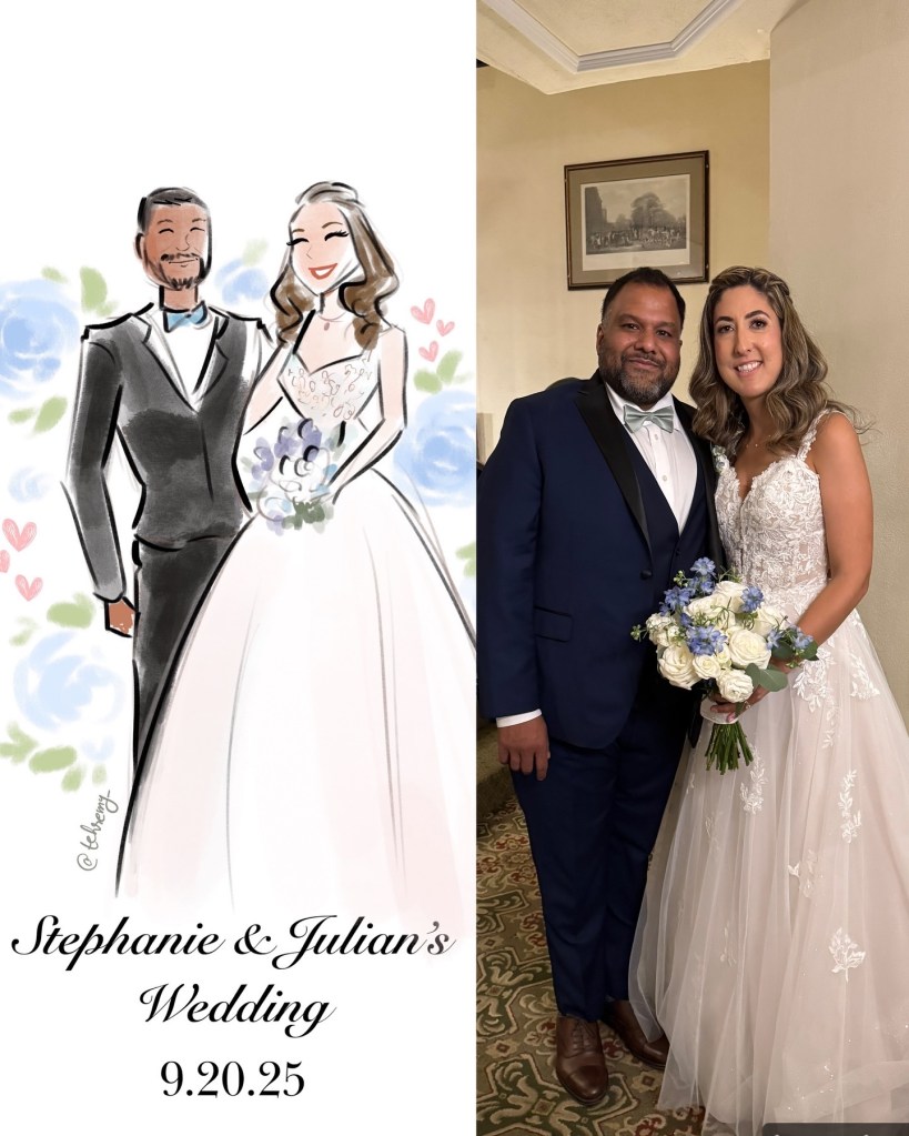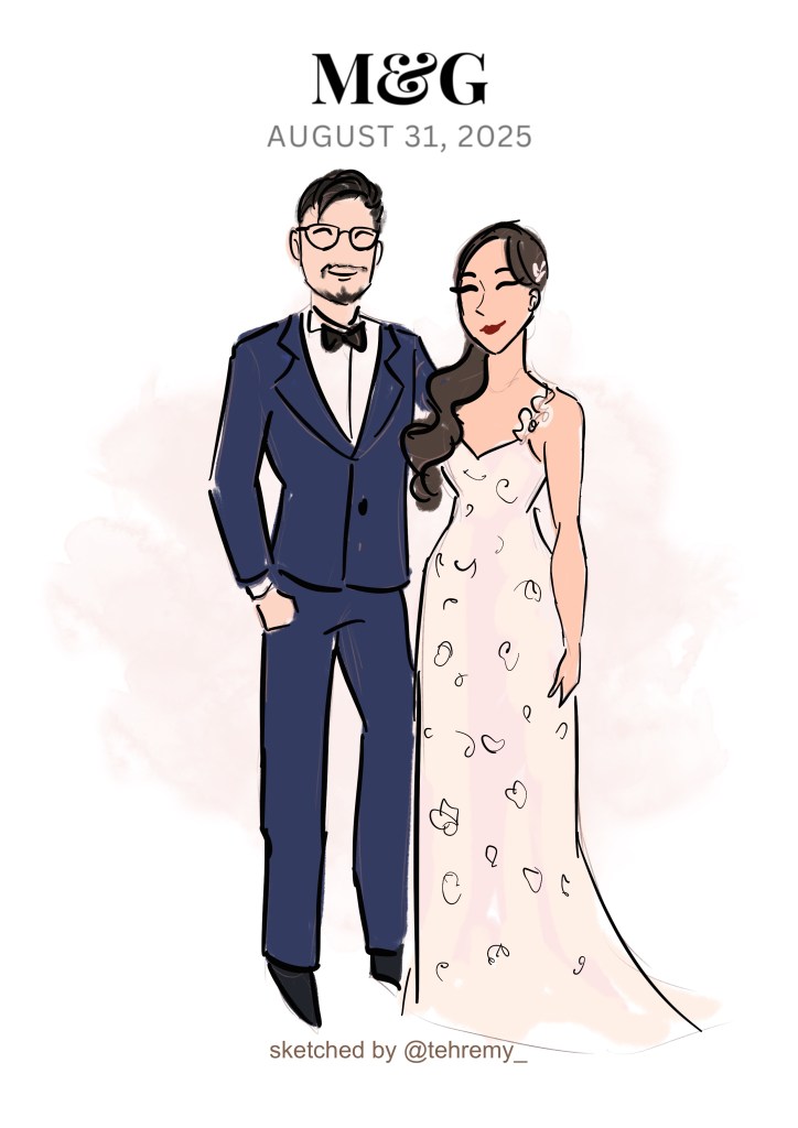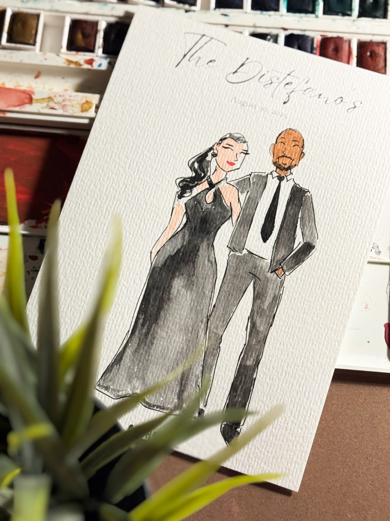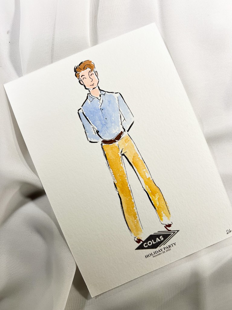 I sketch approximately 12–15 guests per hour on a first-come, first-served basis. Each illustration focuses on the guest’s outfit with minimal facial detail for a chic, editorial look.