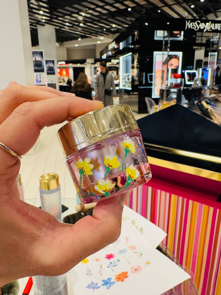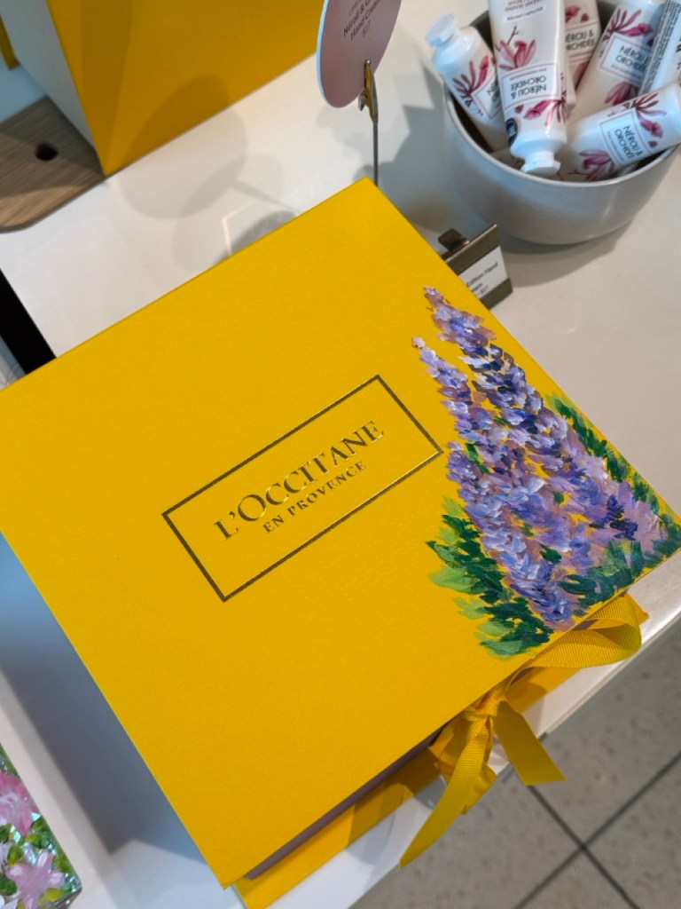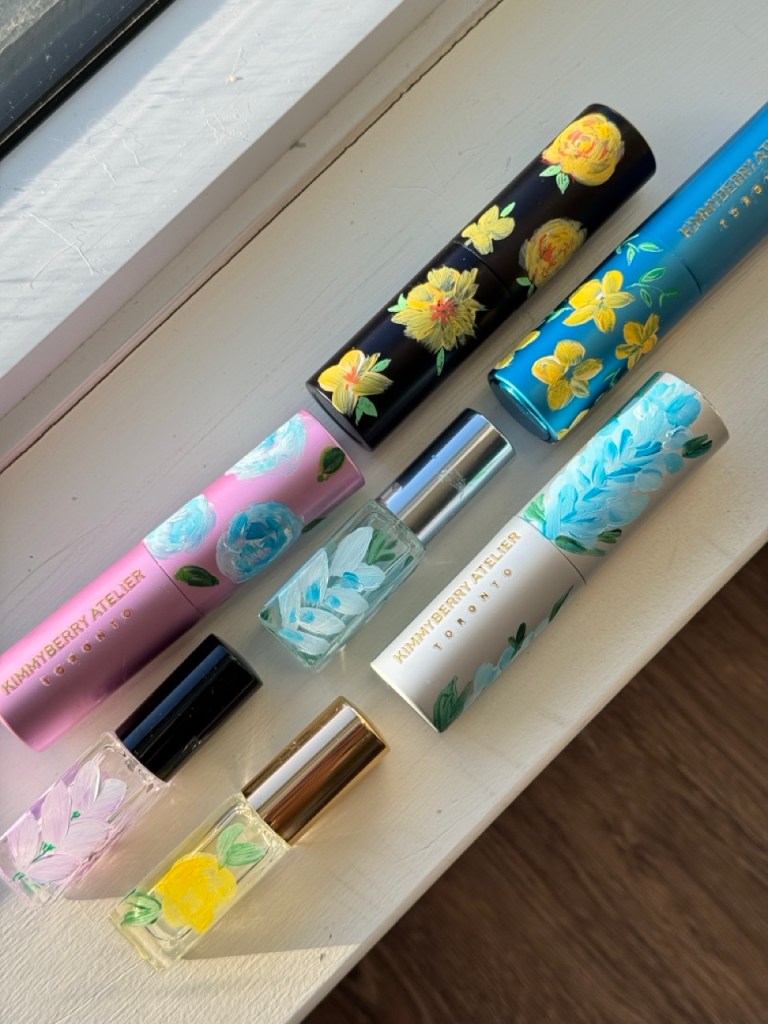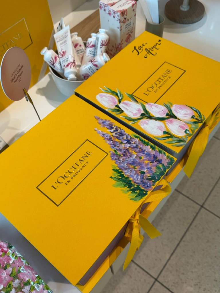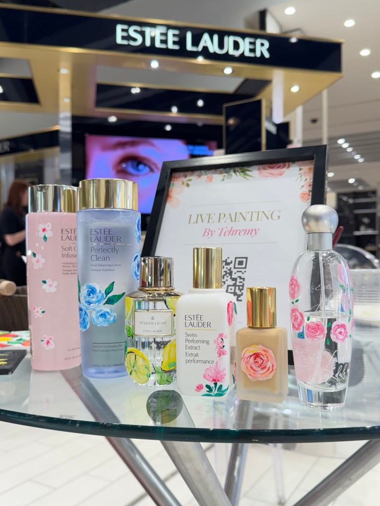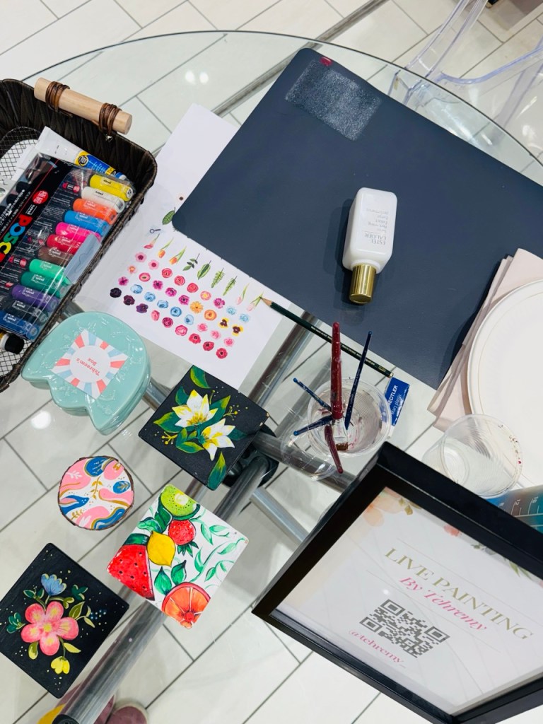 Prior to beginning the product painting process at a store or brand event, I ensure having a small table alotted to me where I can setup. My setup includes paints, paint brushes, inspirational material, my small signage, a mat to protect your furniture and lots of samples. It’s always important to observe professionalism and not create a mess.